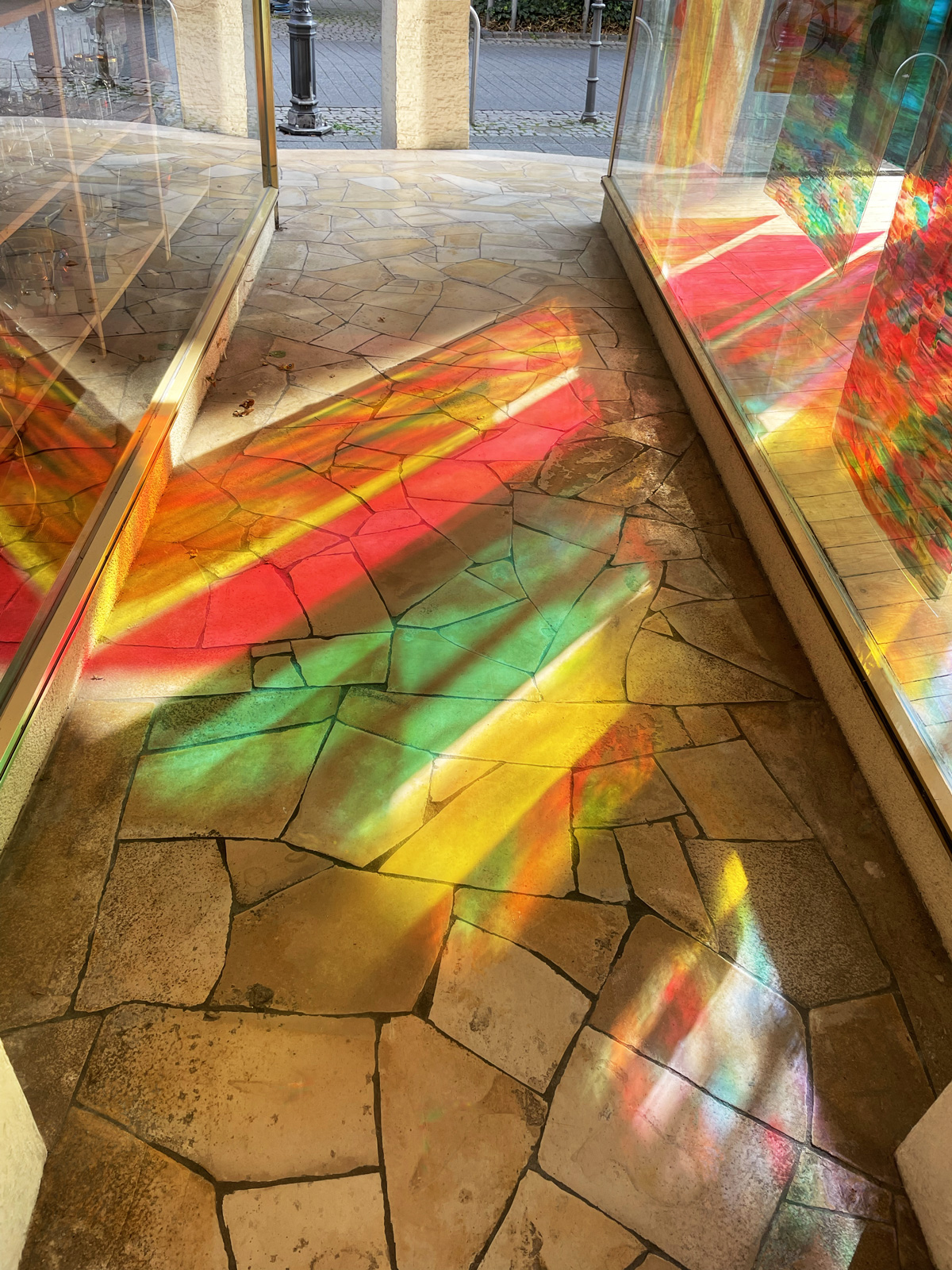 Der Wechsel des Tageslichtes, der Wechsel der Blickachsen und das unterschiedliche Zusammenspiel der Farbigkeiten wird zum übergreifenden Gesamtbild.