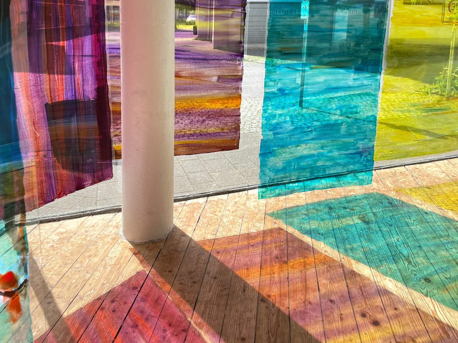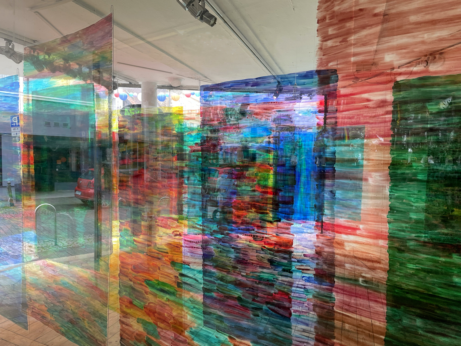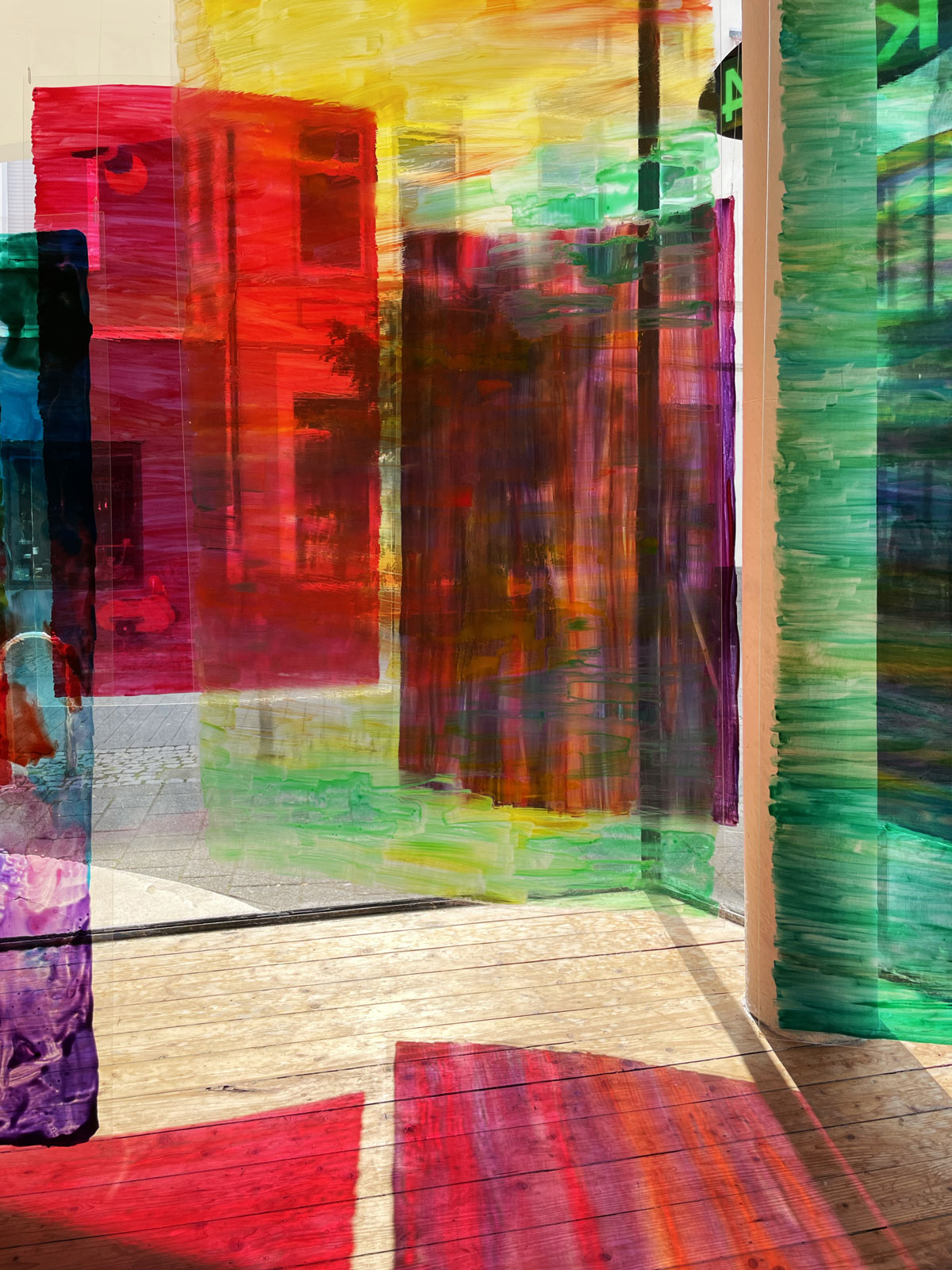 Die Malerei verwickelt den Betrachter in Seh-Erlebnisse durch Spiegelungen der Folientafeln, der Schaufenster und seiner Bewegungen.