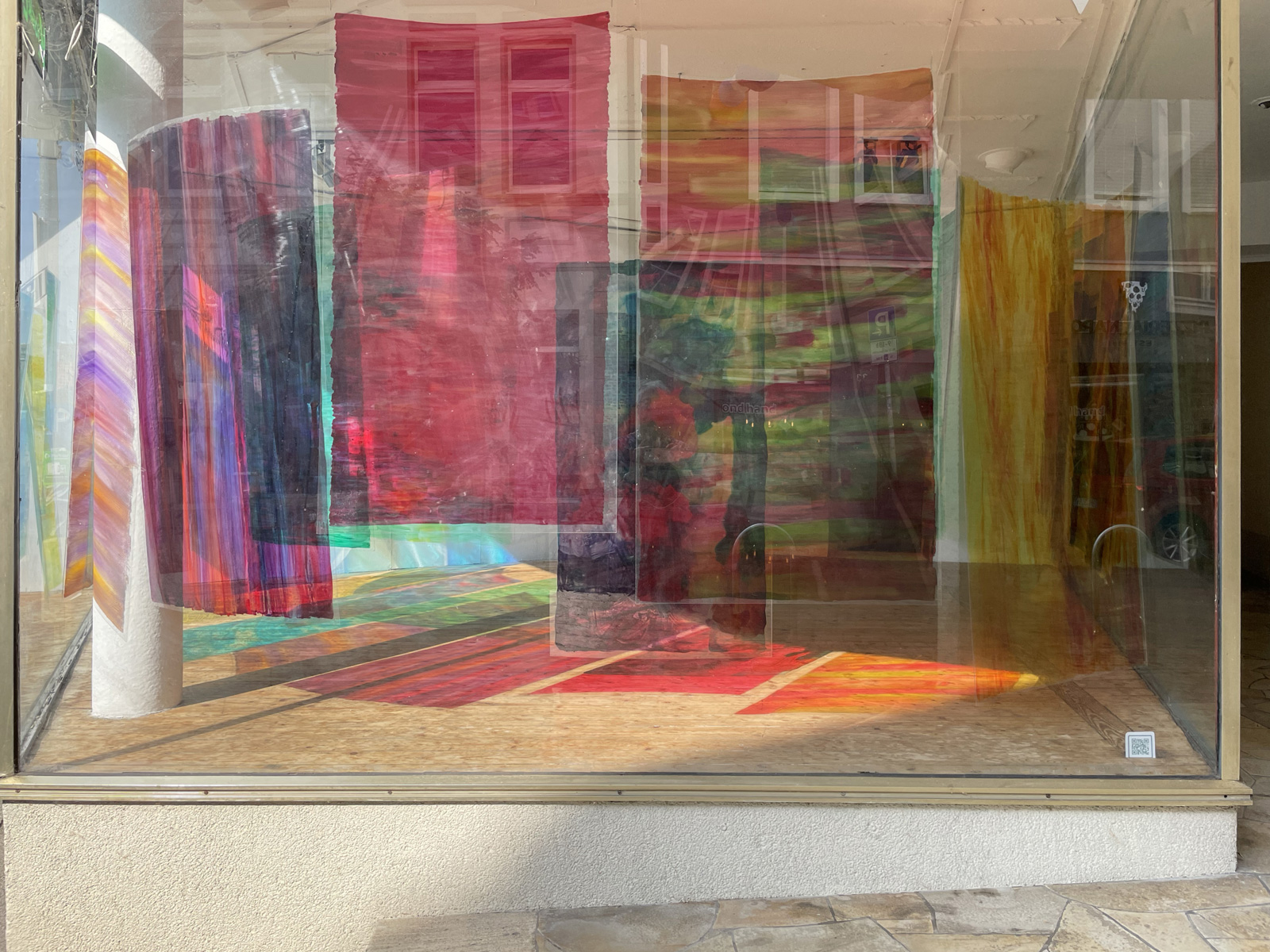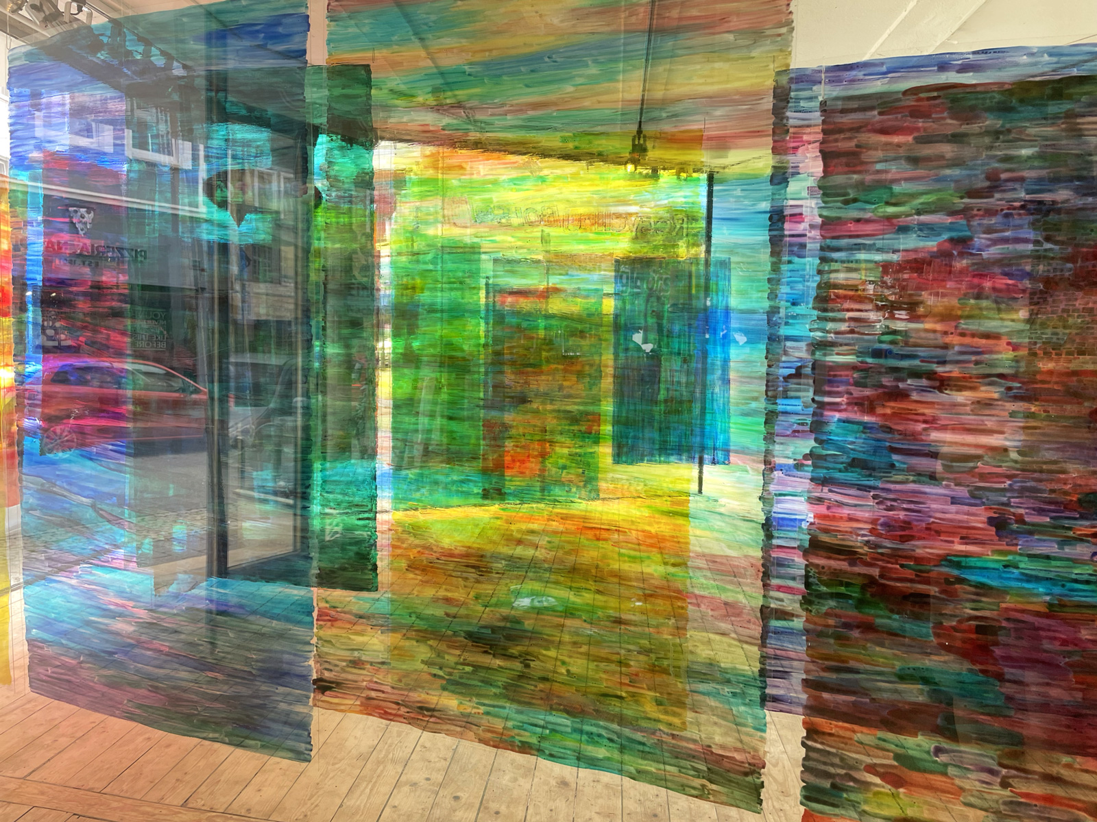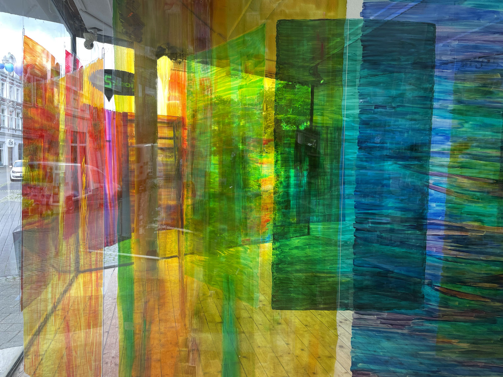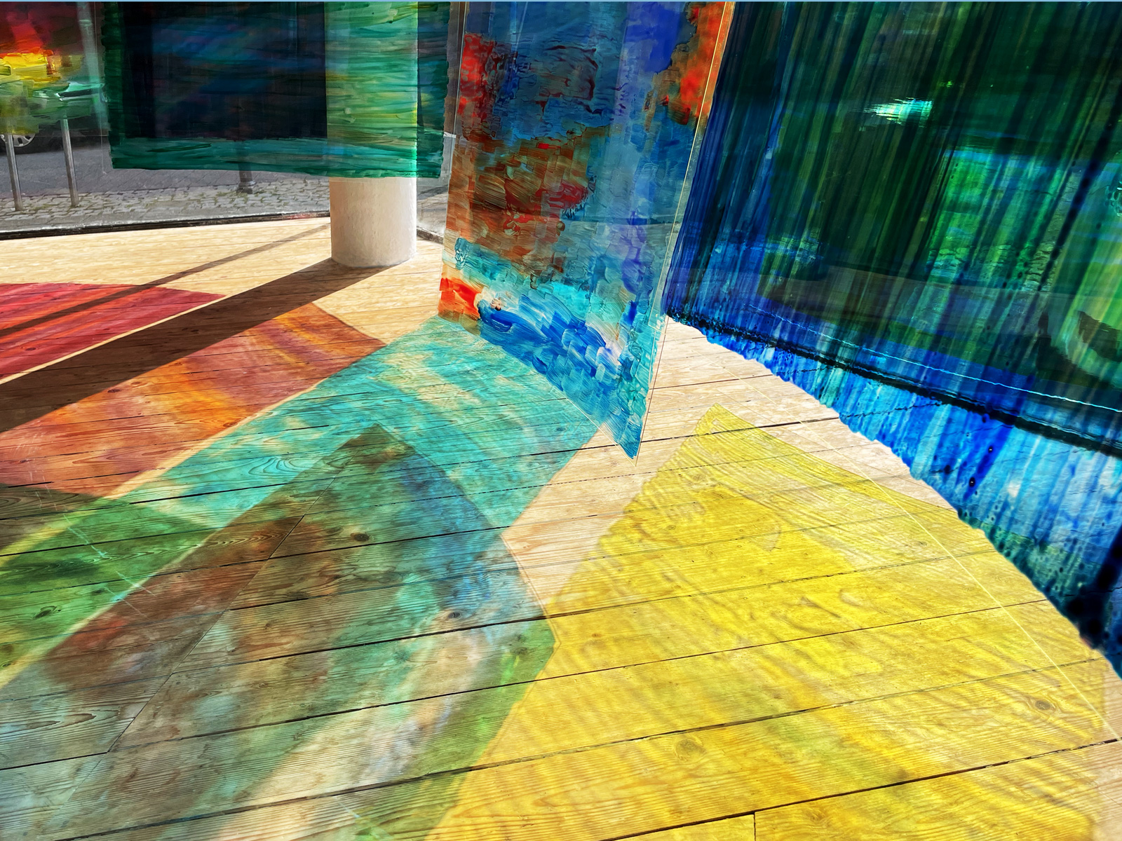 Die Malerei verwickelt den Betrachter in Seh-Erlebnisse durch Spiegelungen der Folientafeln, der Schaufenster und seiner Bewegungen.